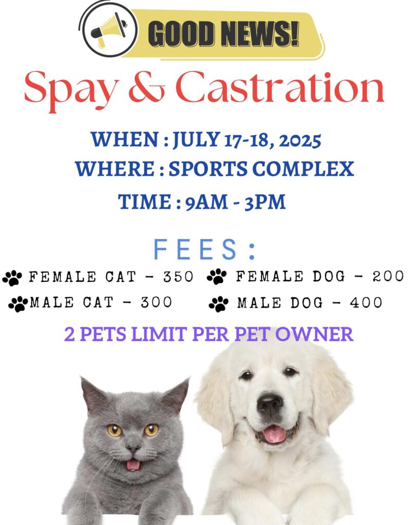 Join us at the Sports Complex for a Spay & Castration Drive on July 17–18, 2025, from 9:00 AM to 3:00 PM.