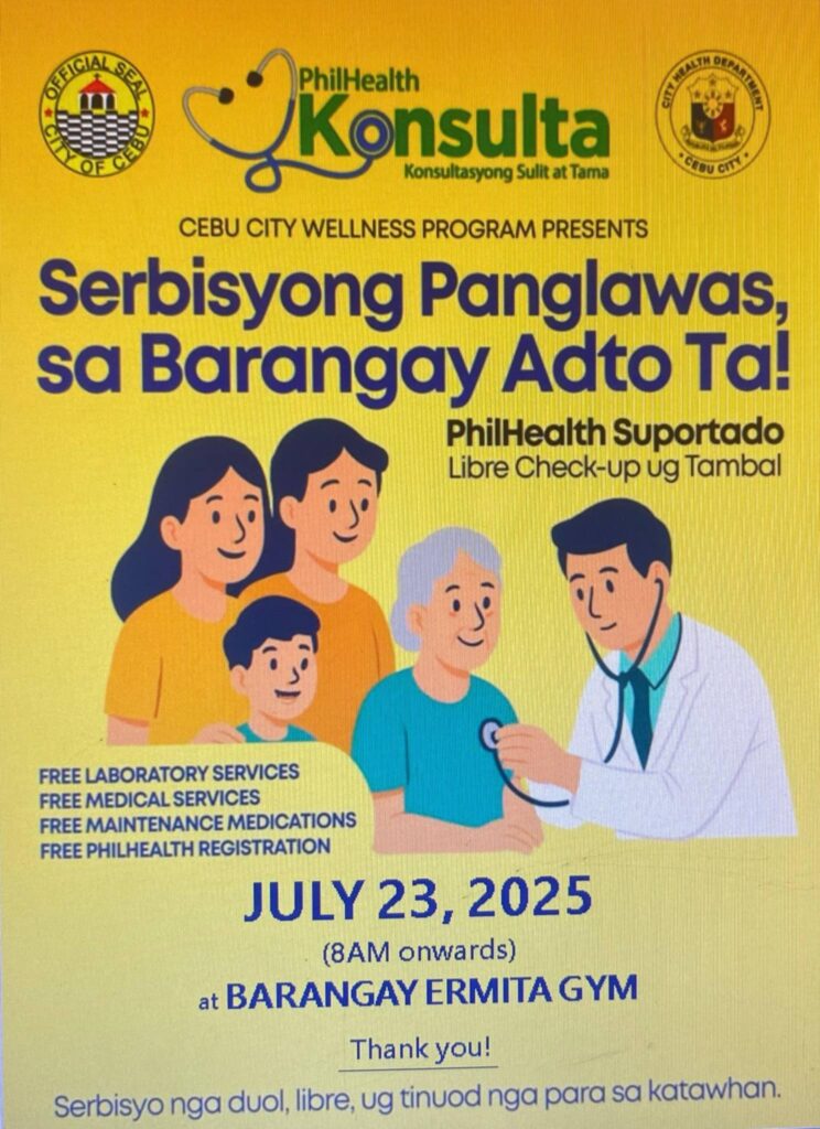 Bisitaha sa atong Brgy Ermita Sports Complex karong adlawa petsa 23 buwan sa Hulyo (8-4pm). Aron sa libreng konsulta ug tambal.