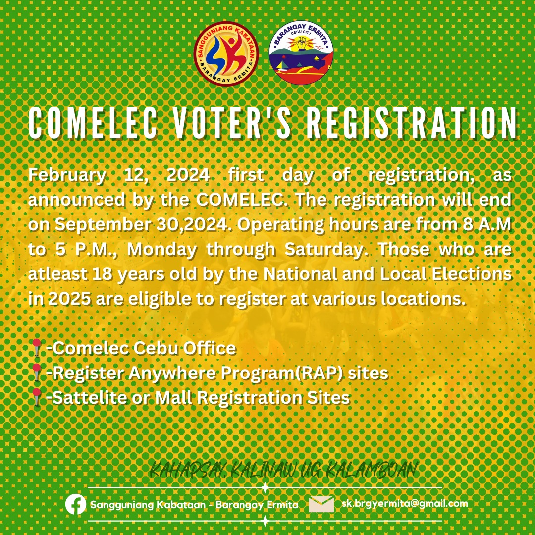 𝐂𝐎𝐌𝐄𝐋𝐄𝐂 𝐕𝐨𝐭𝐞𝐫’𝐬 𝐑𝐞𝐠𝐢𝐬𝐭𝐫𝐚𝐭𝐢𝐨𝐧 February 12, 2024 first day of registration, as announced by the COMELEC….